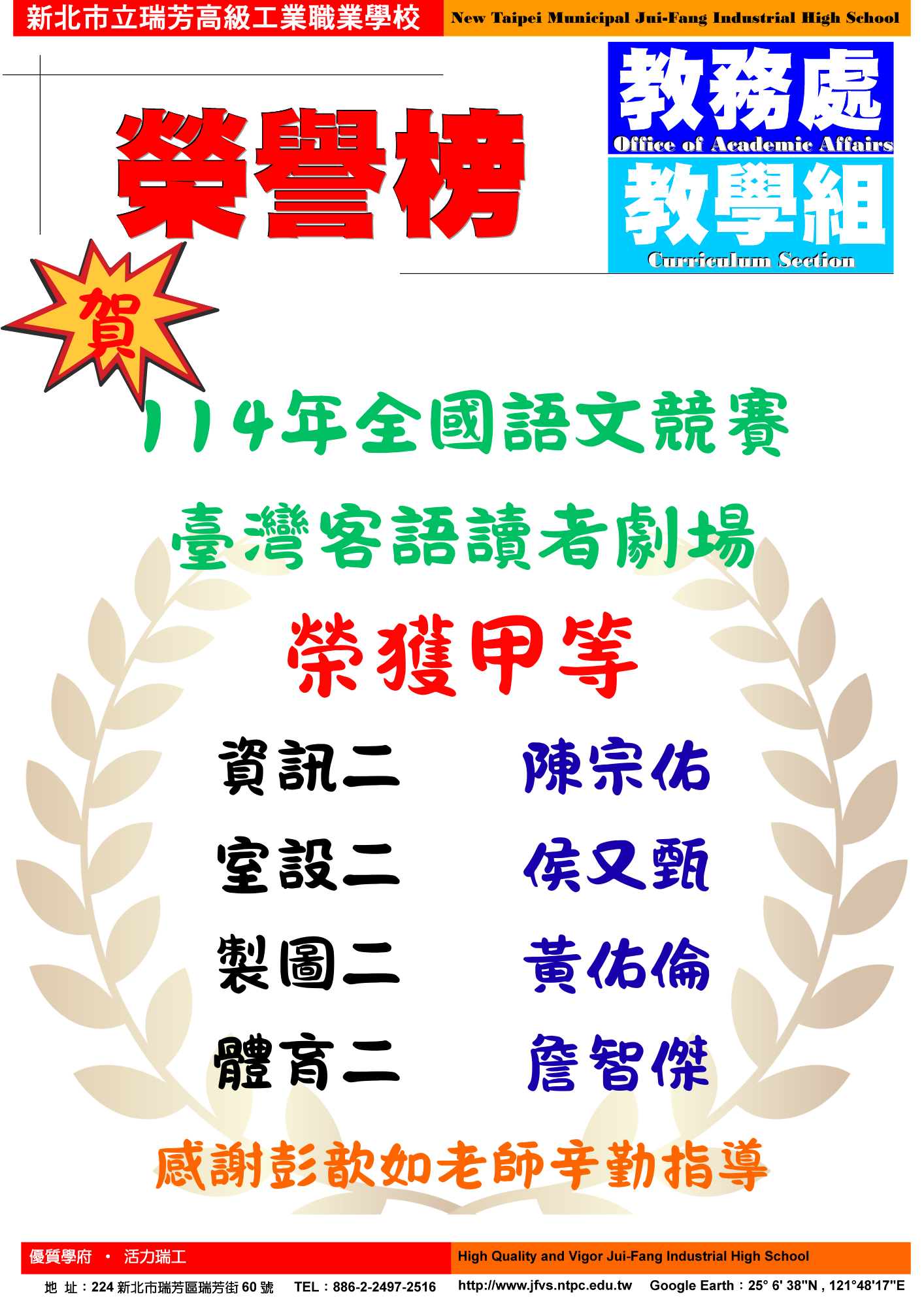 本校參與114年度全國語文競賽臺灣客語讀者劇場榮獲甲等(教務處2025/12/15) - 新北市立瑞芳高工